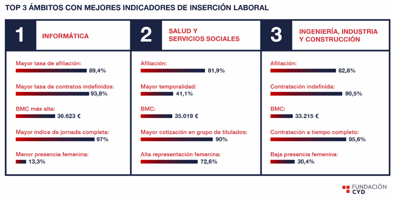Els camps que presenten els millors indicadors globals en inserció laboral són l'Enginyeria en Organització Industrial, l'Enginyeria de Telecomunicació, l'Enginyeria Informàtica, el Desenvolupament de Programari i Aplicacions i l'Enginyeria de So i imatge.